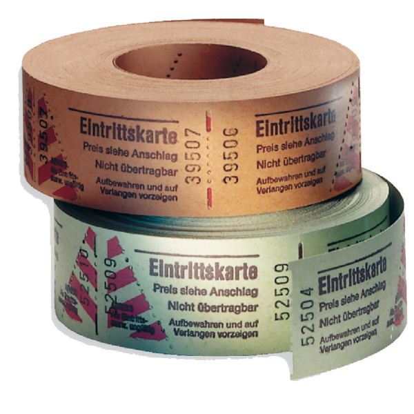 Eintrittsmarke mit Standardaufdruck und Abriss Rollen á 500 Abrisse Grösse: 57x30mm mit fortlaufender Nummerierung Standartaufdruck " Eintrittsmarke" Lagerware sofort verfügbar und versandbereit
